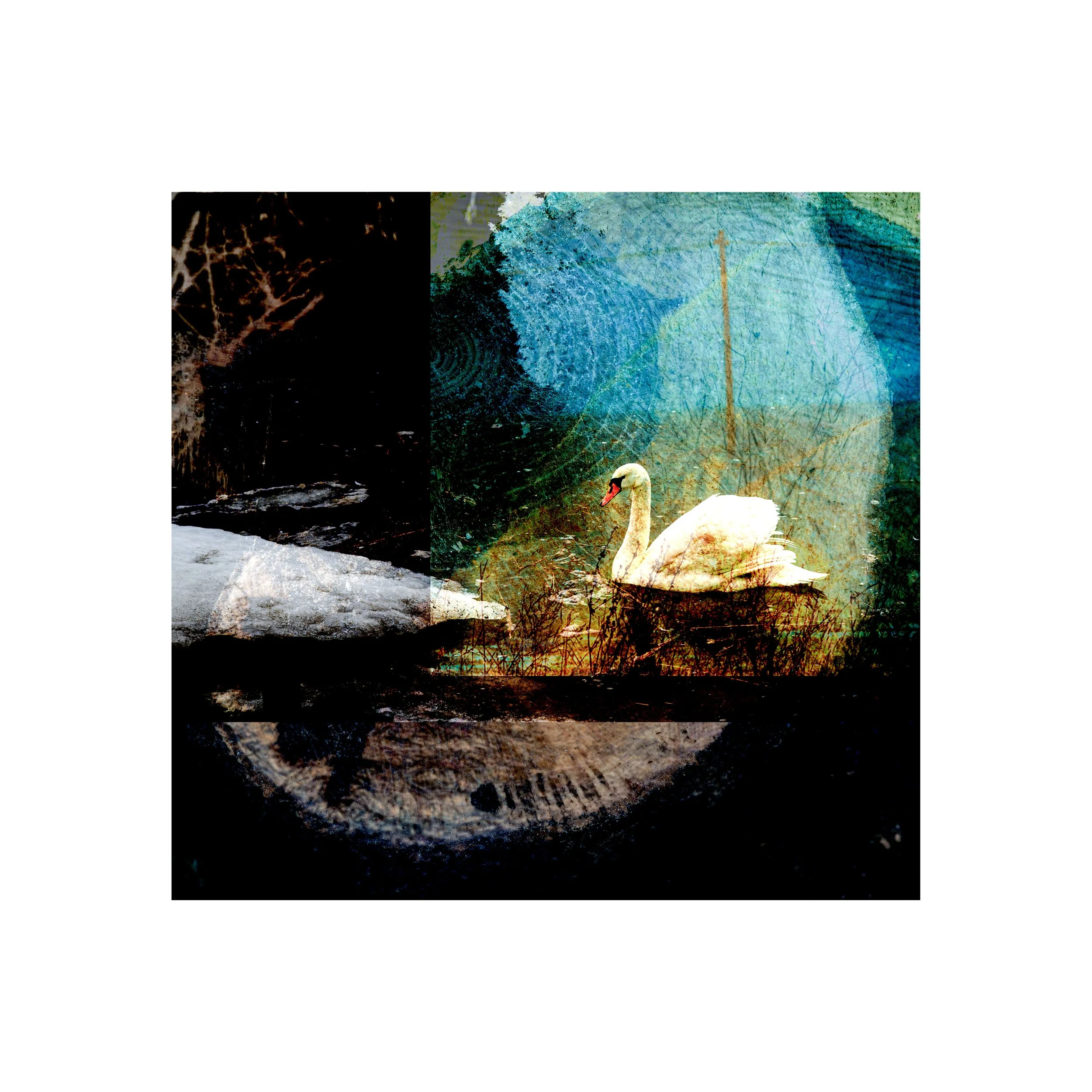 Three stuffed swans photographed without consent and later cropped and reduced to one and a half, with an eagle as background. Digitally edited photograph. Signed and numbered print, edition of 20, 400x400 mm.
