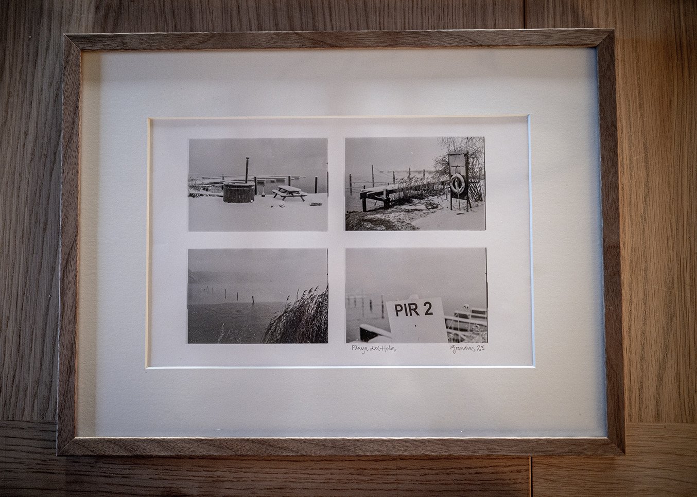 Analogt fotografi fra Holm båthavn på sitt kaldeste. Signert, kr. 900, innrammet.